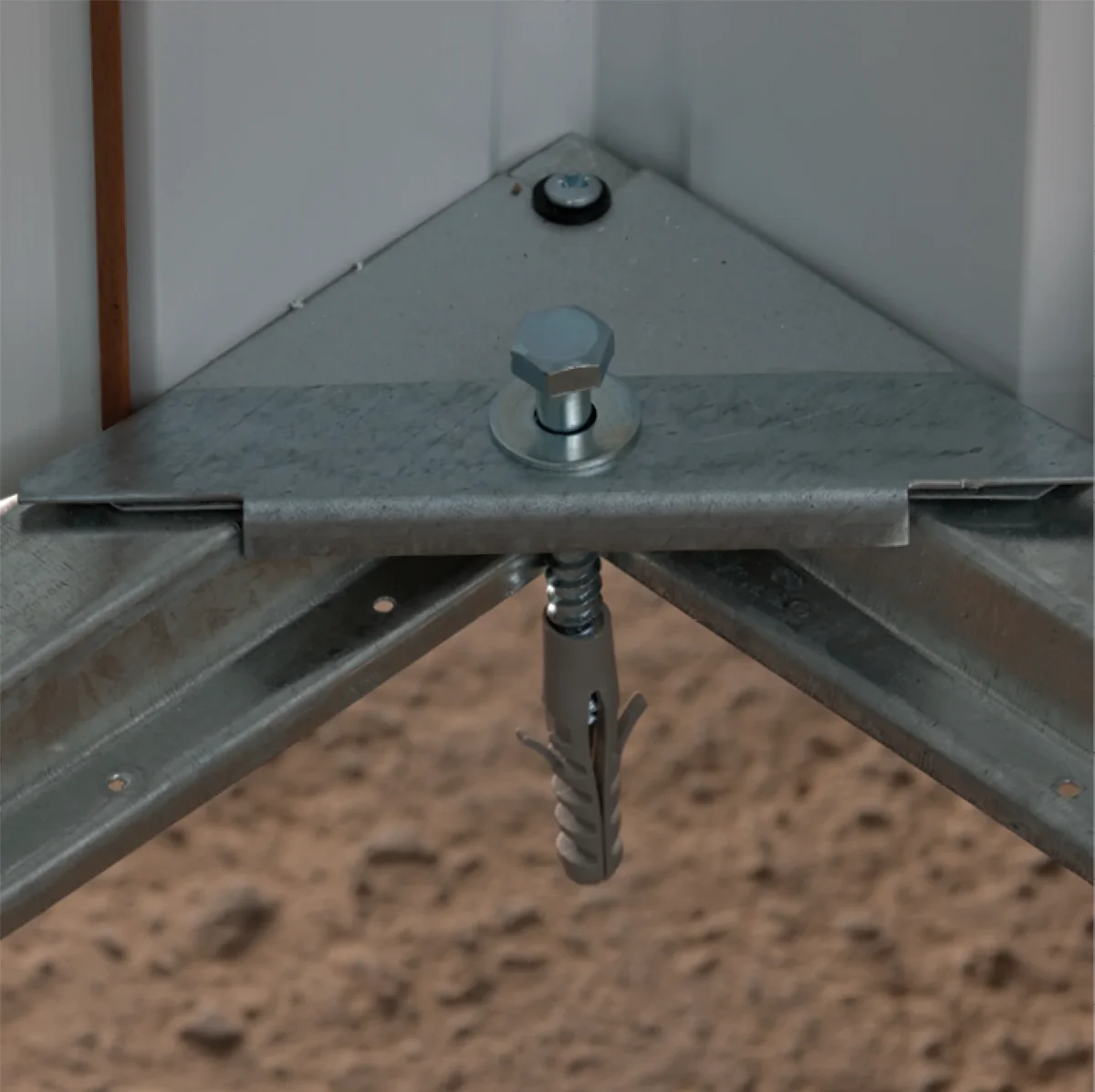 Le fronton translucide apporte de la lumière naturelle à l’intérieur, et le kit d’ancrage inclus permet de fixer solidement l’abri sur une dalle béton ou des plots. Grâce à ses panneaux renforcés (épaisseur 5/10e pour la porte et le fronton, 3/10e pour le toit), il offre une solidité remarquable pour un gabarit aussi compact. Sa visserie électrozinguée garantit une tenue parfaite dans le temps.