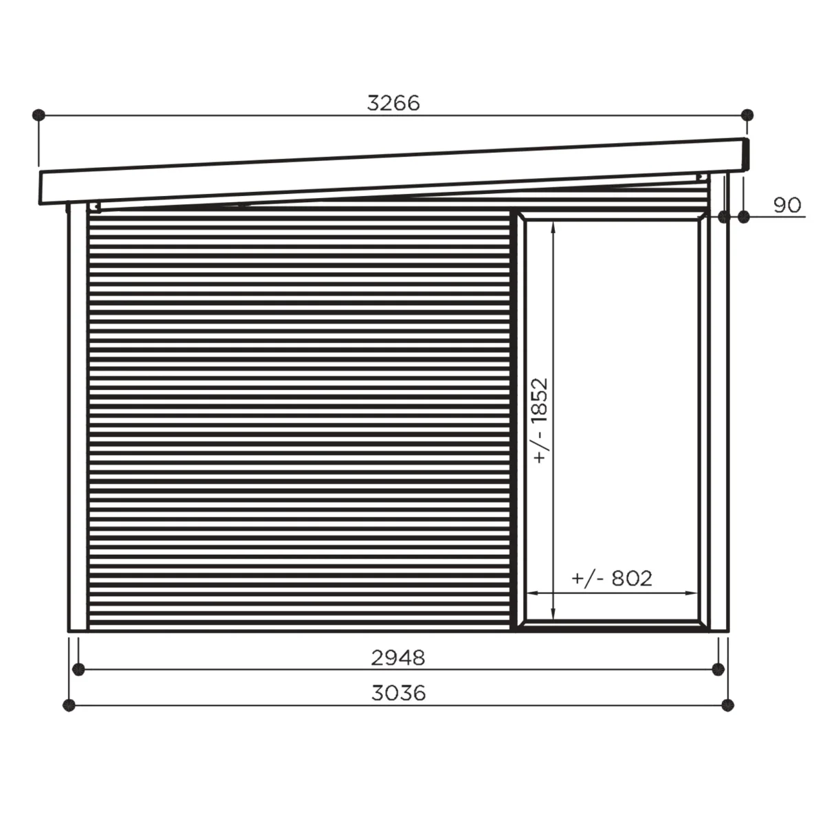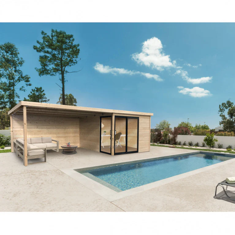 Abri de jardin Sagres Visio – avec espace ouvert – 3,04 x 3,04 + 3,95 m – sapin du Nord certifié – toiture plate – baie vitrée coulissante – bois imprégné