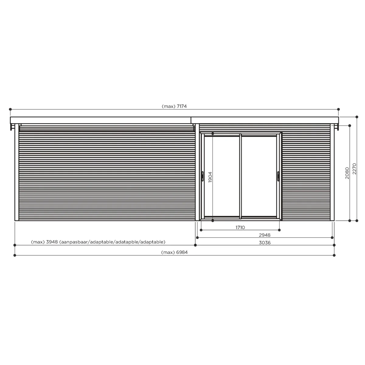 | Largeur hors débordement du toit | 3,040 m + 3,950 m (espace ouvert) |