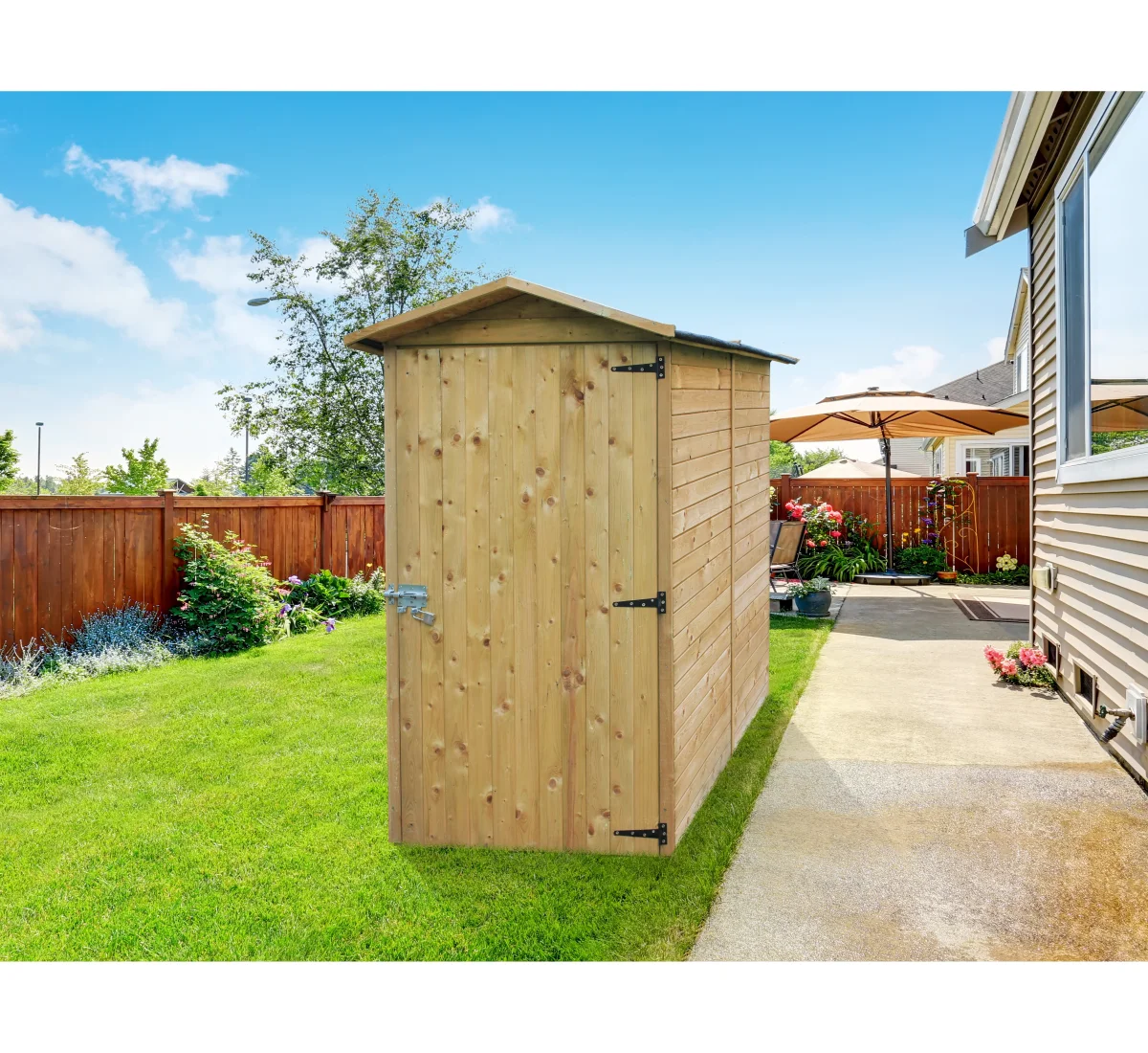 L’accès à l’abri est facilité par une porte simple équipée d’une serrure, permettant de sécuriser vos outils et équipements. Avec ses dimensions intérieures de 0,84 x 1,83 m et une surface utile de 1,66 m², il offre un espace de rangement adapté aux outils de jardin, accessoires ou petit mobilier extérieur. Le roofing inclus protège efficacement la toiture contre l’humidité et prolonge la durabilité de l’ensemble.