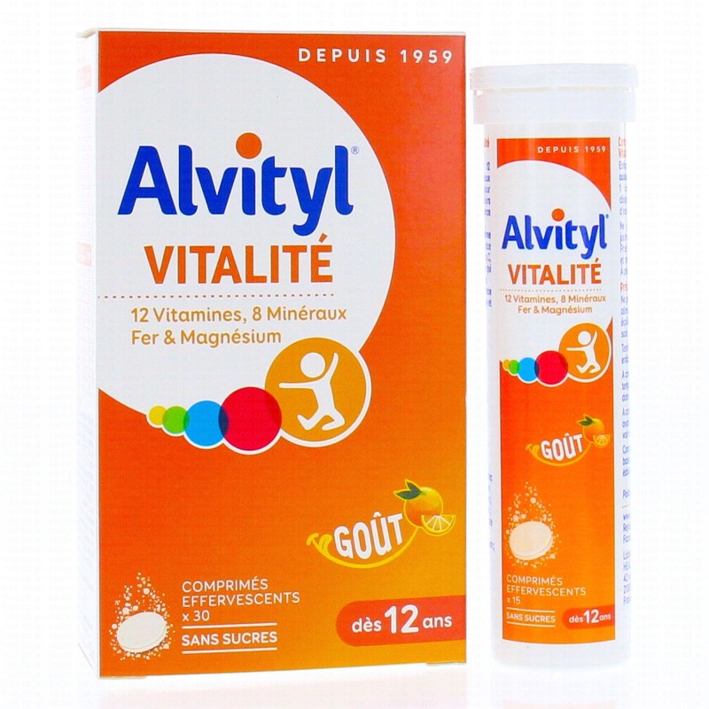 Alvityl® Vitalité effervescent est une formule complète de 12 vitamines et 10 minéraux adaptée pour les pré-adolescents dès 12 ans et pour les plus grands. Le comprimé effervescent est à diluer dans un grand verre d’eau pour une boisson vitaminée au bon goût orange. Sa formule est sans sucres et sans ajout de colorants artificiels.