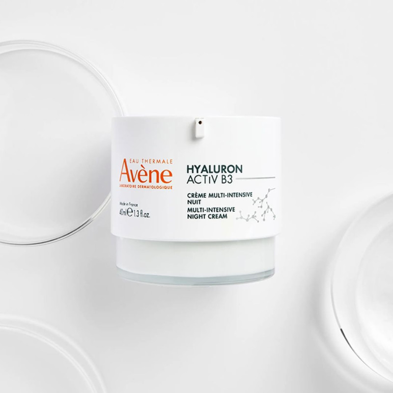 AVENE HYALURON ACTIV B3 CREME MULTI INTENSIVE NUIT 40ML est spécialement formulée pour hydrater intensément et réduire les signes de fatigue cutanée. De plus, elle répare et apaise la peau pendant la nuit.