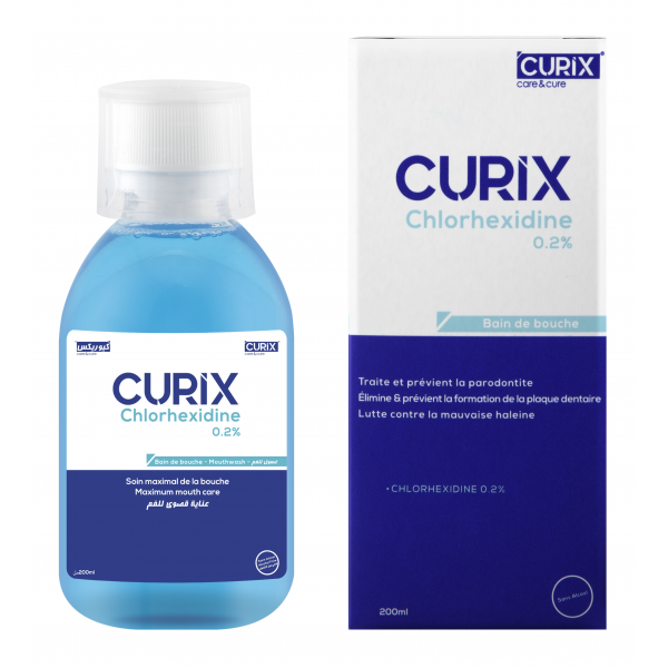 Le bain de bouche CURIX Chlorhexidine 0.2 % traite et prévient la parodontite et prévient la formation de plaque dentaire.