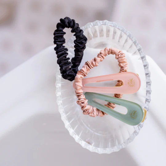 Le duo de chouchous roses 2 en 1, qui subliment et prennent soin des cheveux. 100% soie
