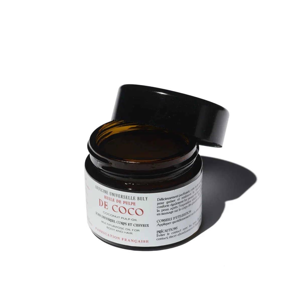 Avec son odeur délicieusement sucrée, l’huile de pulpe de coco, tantôt solide ou liquide selon la température, est un soin hydratant, émollient et gainant, facilement assimilable par la peau et les cheveux.