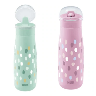 Gourde Mini-Me Flip, en plastique (PP), composée à 80 % de matériaux durables, avec embout 2 en 1 non mordable, gobelet avec paille et gourde en même temps, incassable, étanche, avec capuchon de protection pour les déplacements, passe au lave-vaisselle, ne convient pas aux boissons chaudes ou gazeuses. Convient aux boissons, peut être combiné avec tous les produits NUK Mini-Me, à partir de 12 mois.
