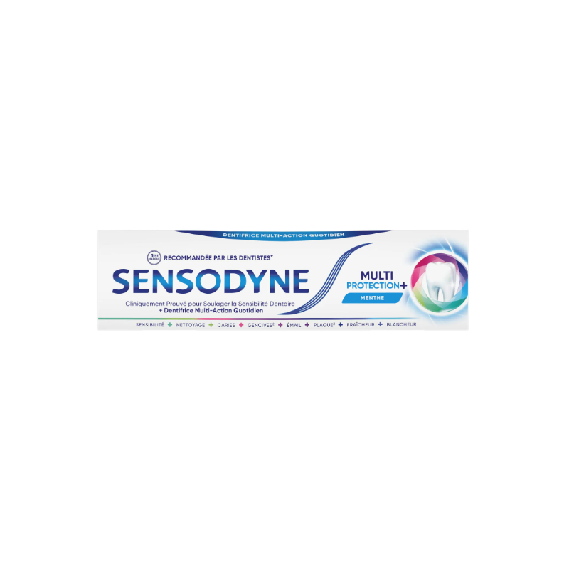 La formule du dentifrice Multi Protection des laboratoires Sensodyne permet de maintenir la blancheur naturelle de vos dents. Riche en fluor, il protège et renforce l’émail de vos dents, tout en vous procurant une haleine fraîche. La Novamin présente dans ce dentifrice permet de restaurer une couche protectrice sur les zones sensibles de vos dents.