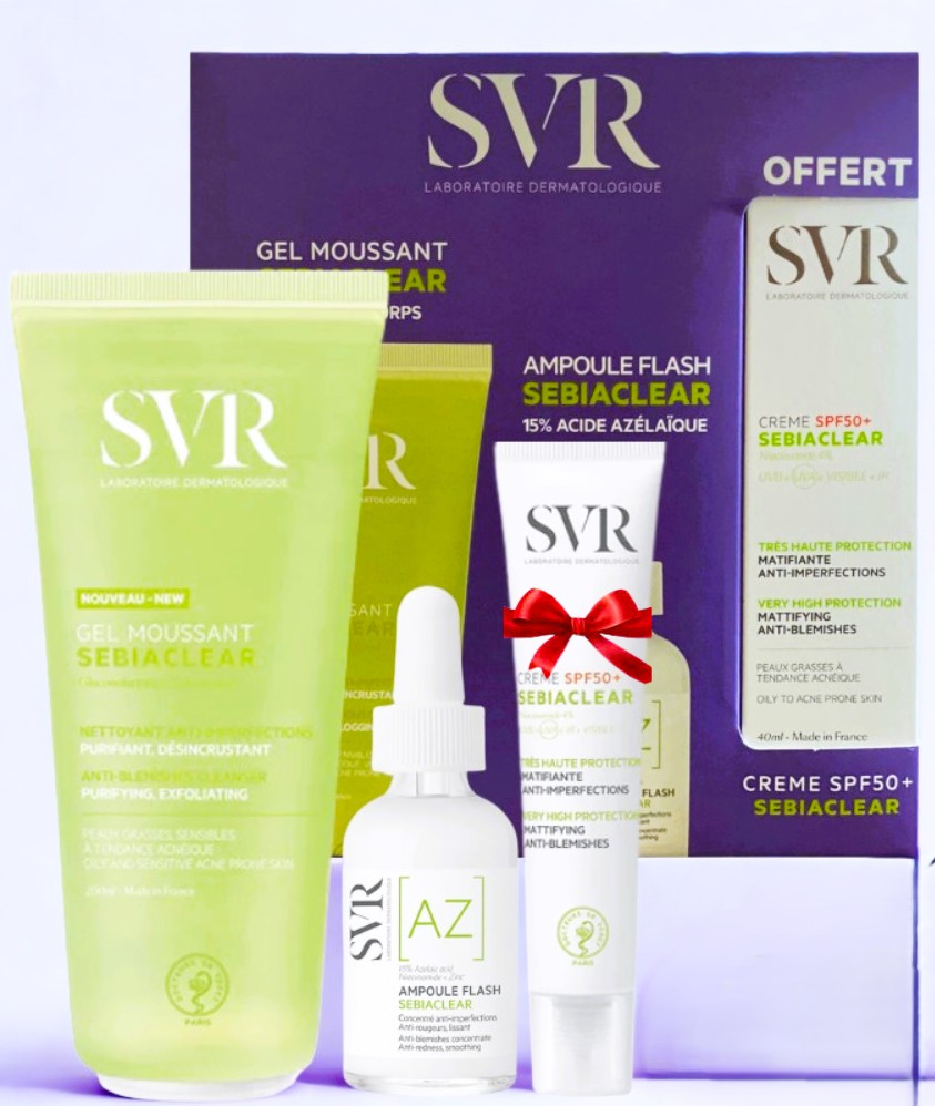 Routine complète anti-imperfections avec le Coffret SVR Sebiaclear : Gel Moussant 200ml Ampoule AZ Flash 30ml Crème Solaire Matifiante SPF50 40ml offerte