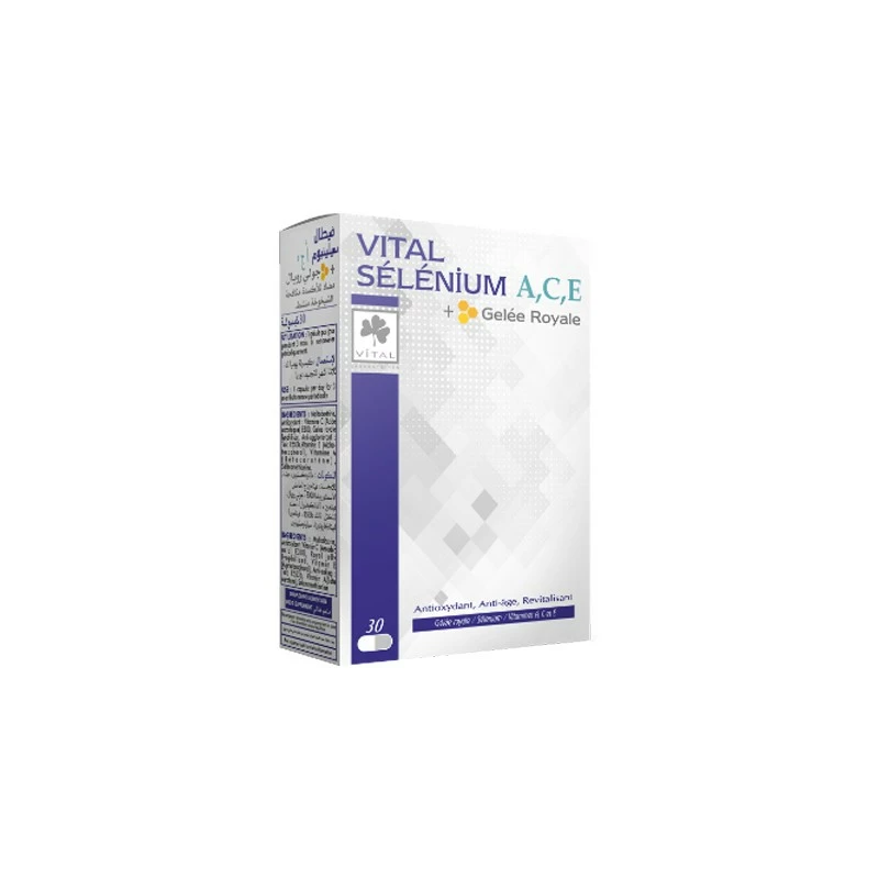 VITAL SELENIUM ACE est un Complément alimentaire qui contient le Selenium oligo-élément essentiel indispensable au bon fonctionnement de l’organisme. Le sélénium est indispensable au fonctionnement d’une enzyme essentielle à la détoxification des radicaux libres. – Antioxydant – Anti-âge – Revitalisant Boite de 30 gélules