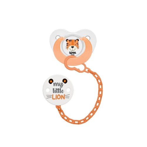 La sucette Wee Baby, accompagnée de sa chaîne pour les bébés de 6 à 18 mois, nécessite une vérification de l’embout avant chaque utilisation. Assurez-vous qu’il n’y ait aucune déformation avant de la donner au bébé.